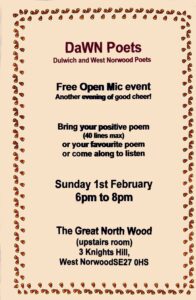 Bring your positive poem (40 lines max), or your favourite poem, or come along to listen!