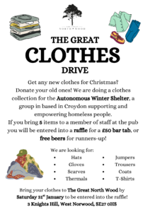 Get any new clothes for Christmas? Donate your old ones! We are doing a clothes collection for the Autonomous Winter Shelter, a group in based in Croydon supporting and empowering homeless people. If you bring 5 items to a member of staff at the pub you will be entered into a raffle for a £50 bar tab, or free beers for runners-up!