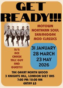 Get Ready returns to The Great North Wood! Put on your dancing shoes and move to the sounds of classic Soul, Ska, Reggae and Mod Classics. All spun on original Vinyl by d.j’s Rex, Cheese, Talc Guy and guest.